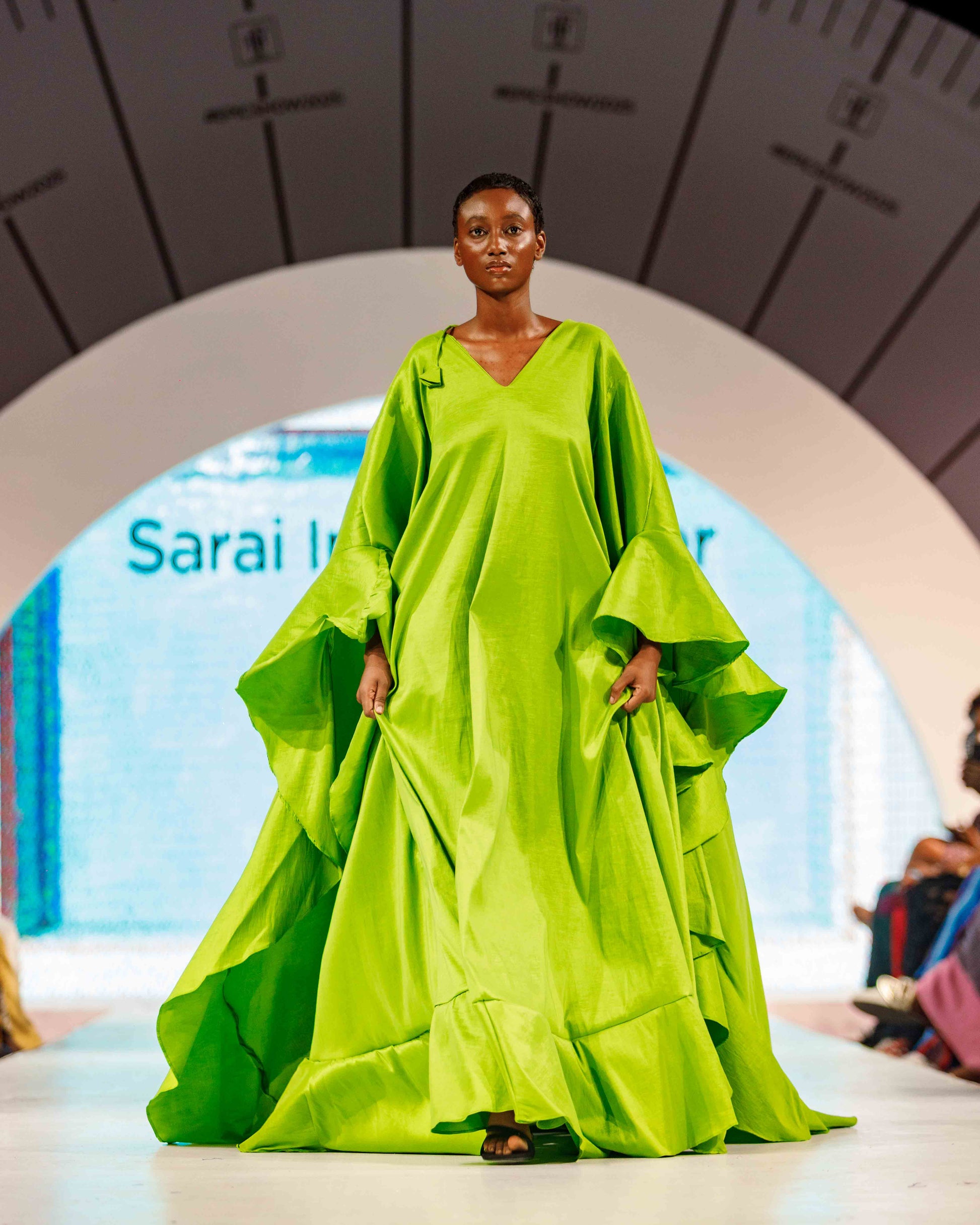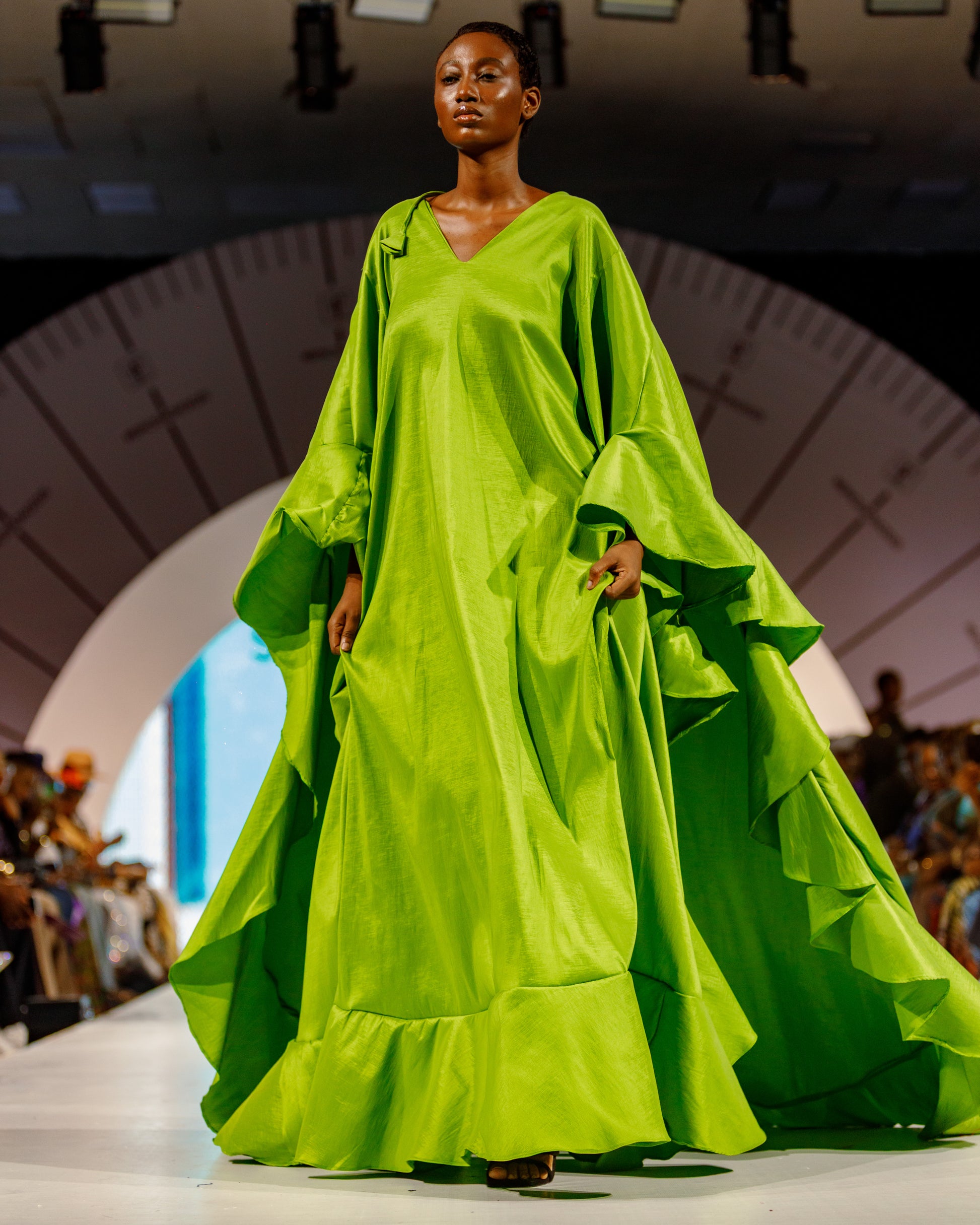 The Eniola Dress is not just a garment — it’s an experience. Sculpted from luminous lime green taffeta, this piece commands attention with every swish, whispering elegance and purpose as it moves. The crisp structure of the fabric adds drama and fluidity, allowing the exaggerated silhouette to hold its form while flowing effortlessly with your stride.