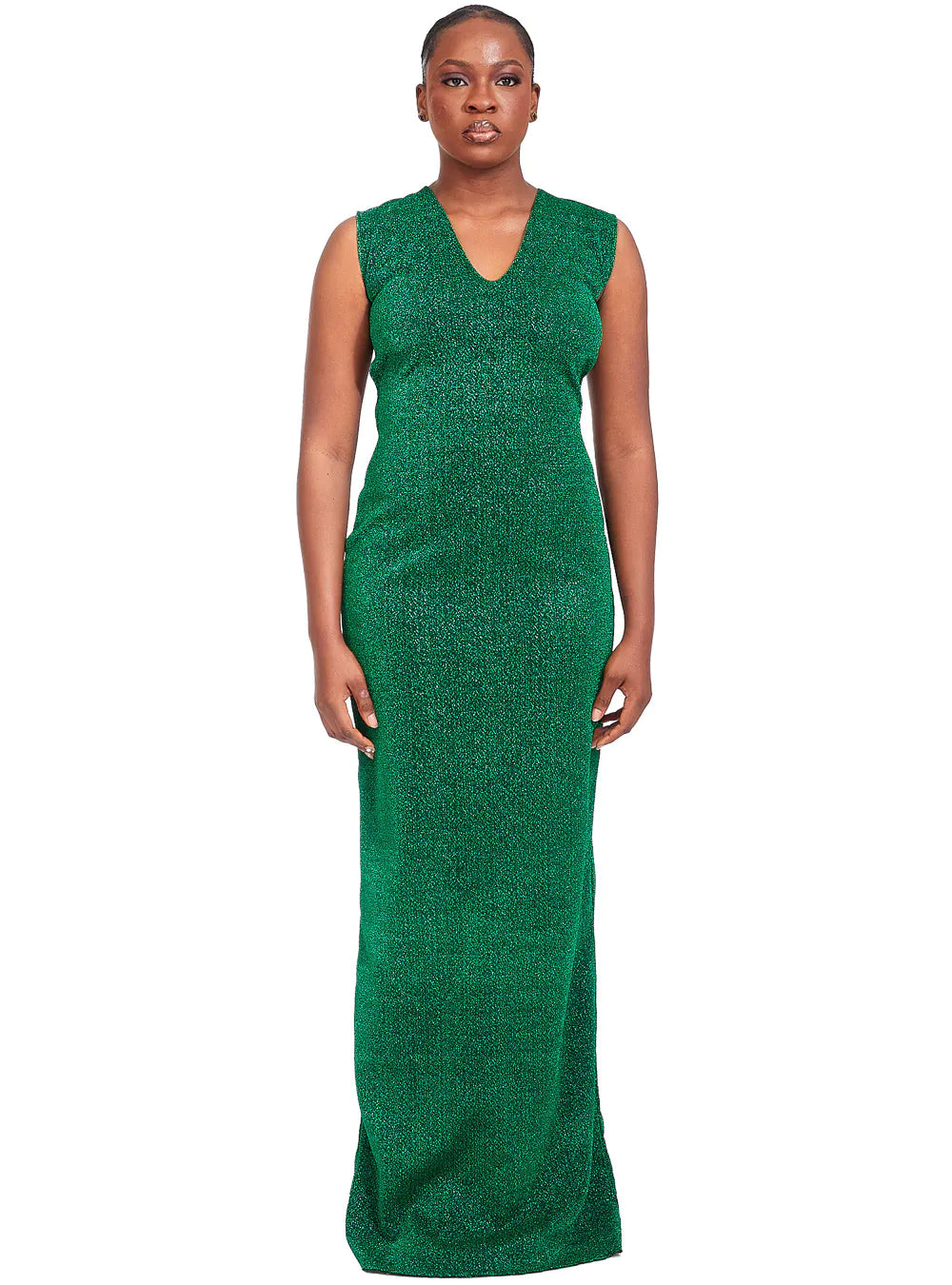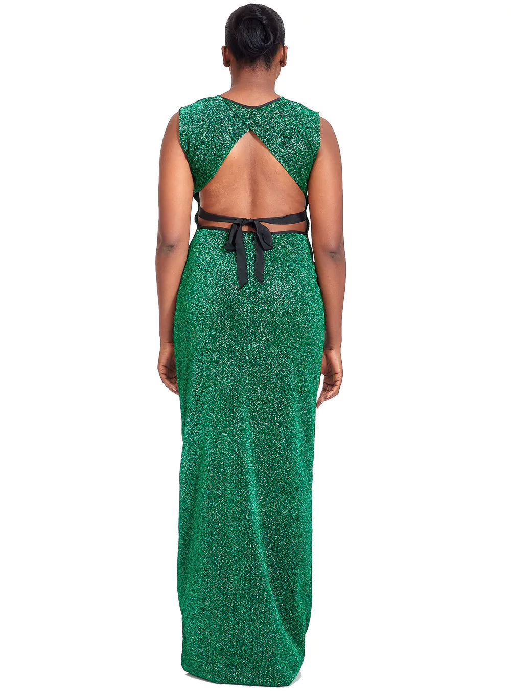 The Gia Dress is a striking green piece made from a rare, limited-edition fabric — only two pieces were ever created, and just one is left.