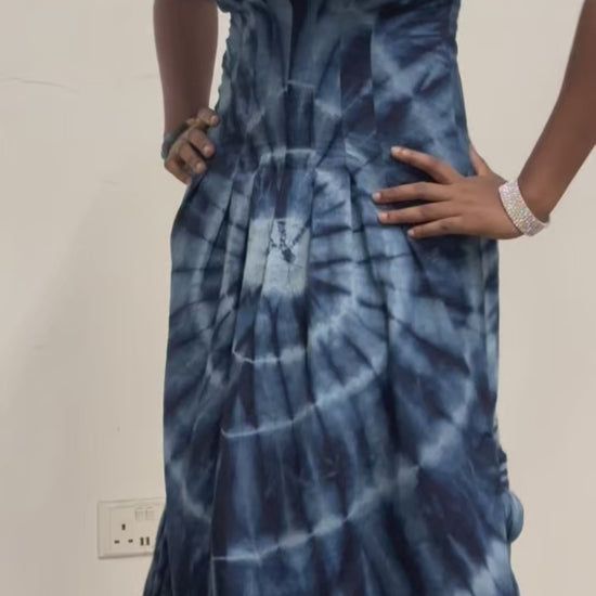Handcrafted from 100% biodegradable cotton ethically sourced from Funtua, Nigeria, this dress is naturally dyed in a 500-year-old indigo dye pit in Kano, preserving the age-old artistry of African indigo dyeing.