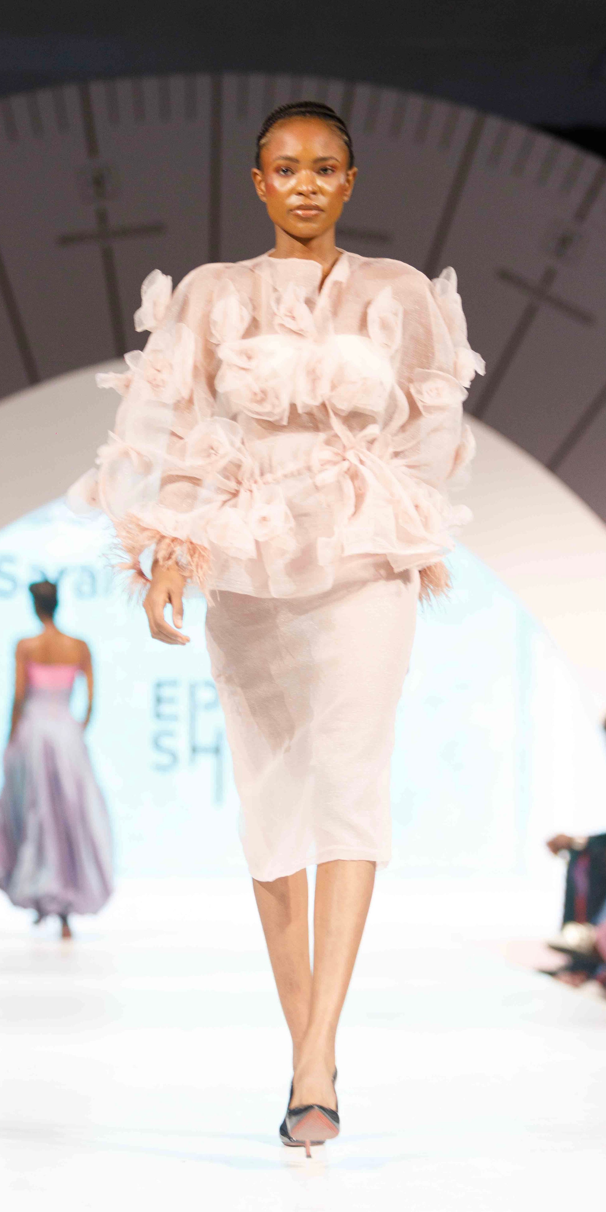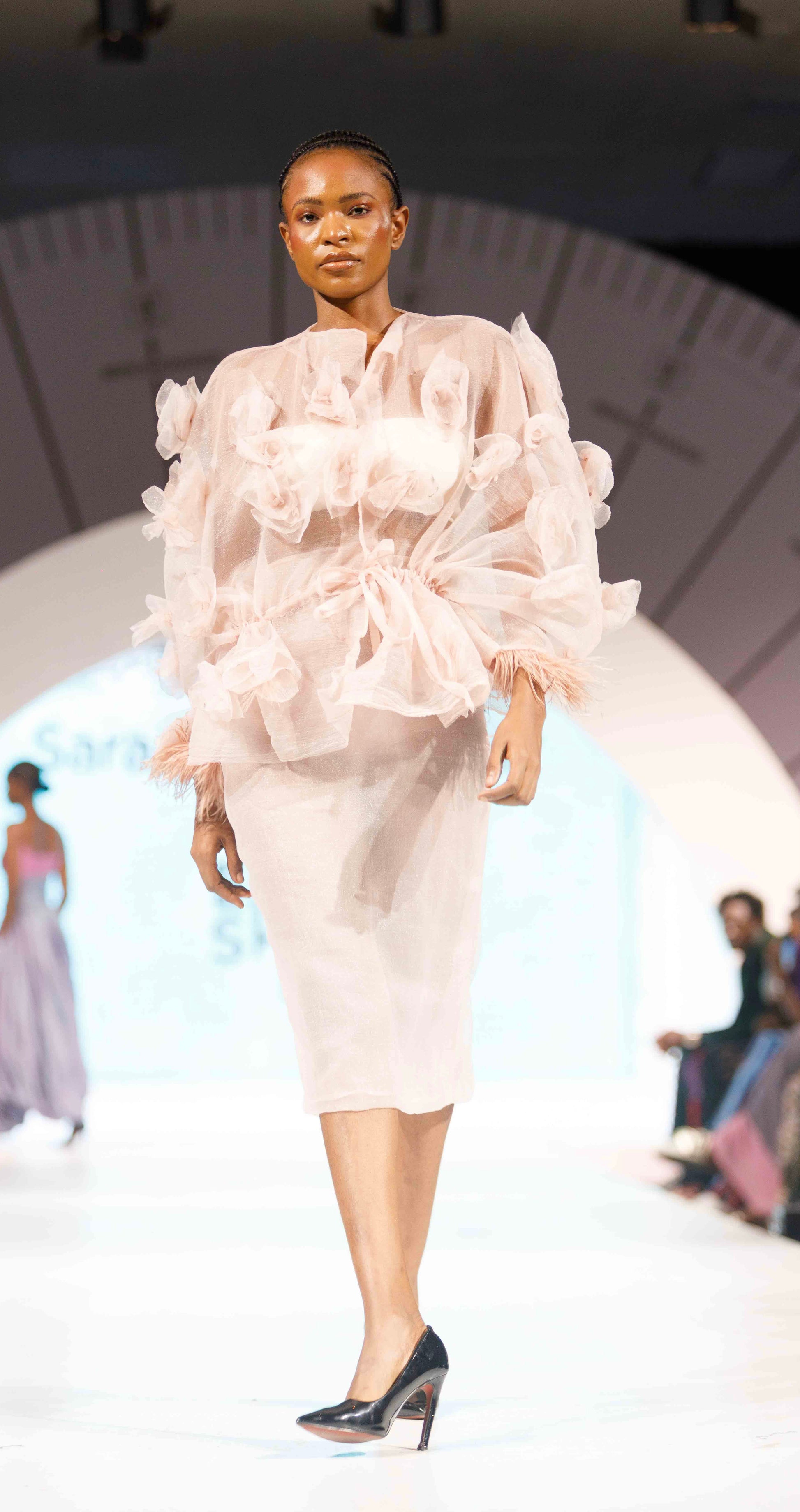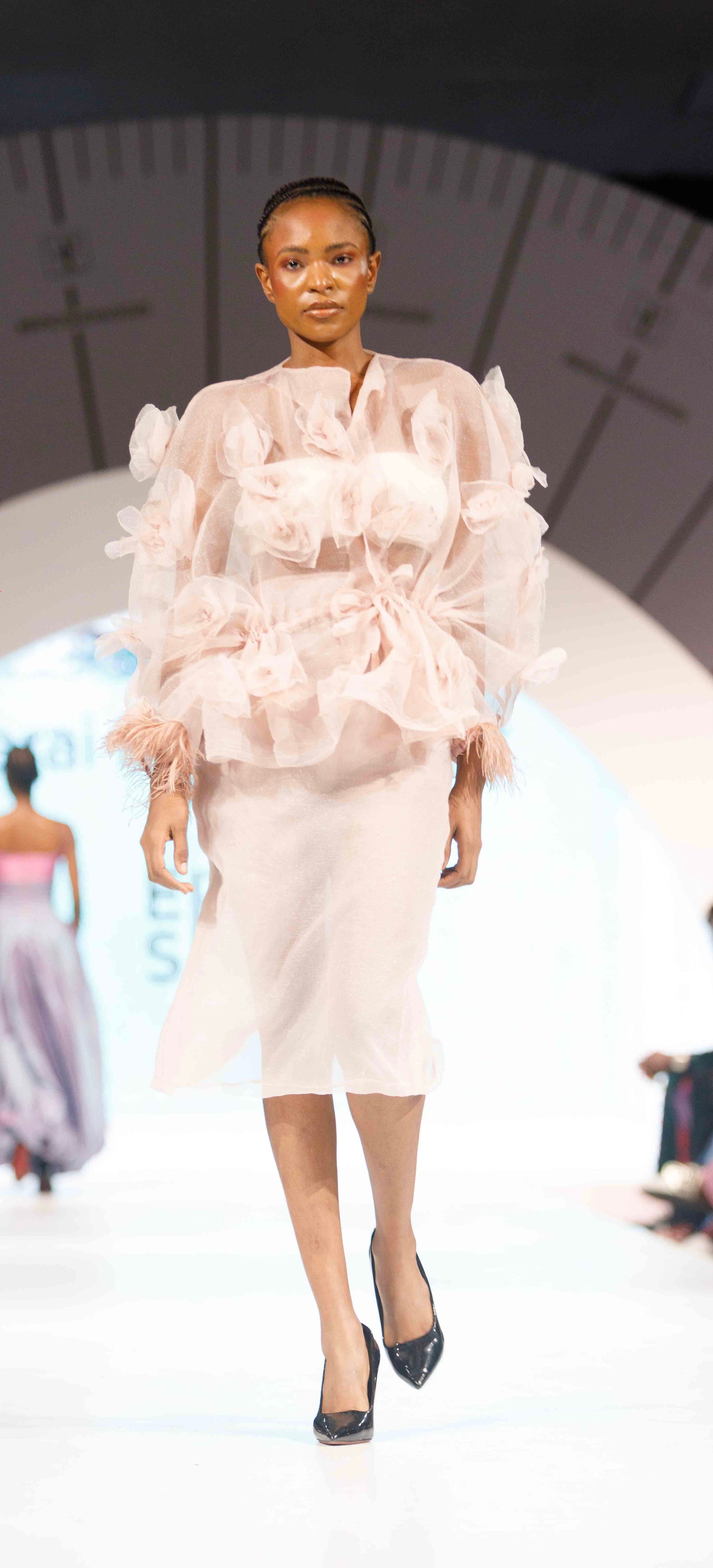The Yalwa Set features a structured blush organza top with dramatic 3D floral appliqués and ruched detailing, paired with a sleek pencil skirt crafted from the same sheer organza fabric. The statement sleeves are accented with whimsical feather cuffs, giving every movement a sense of regal flair.